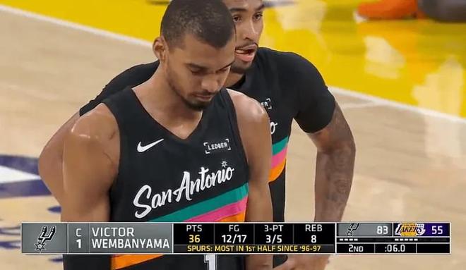 这种文班亚马算是打开心了。首节就9中8获得25分,半场37分,而全场比赛打了26分钟就获得了40分。因为湖人内线没什么防守能力,文班亚马只要进去就可以进球,再加上三分命中率还非常好,他保持了完美的输出。