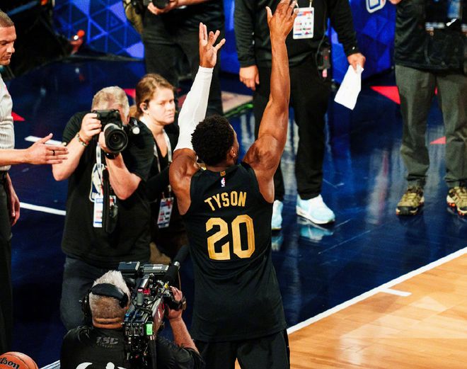 但是,我再说几个细节。第一,半个月前骑士主场30分大胜湖人一战,虽然骑士给老詹准备了致敬视频,但赛后泰森直接打断米切尔的采访,说出那句:“当下是米切尔的城市!”米切尔听到泰森这么说,笑得很开心,而事后米切尔也感谢泰森,表示归根结底,是詹姆斯为骑士拿到首座总冠军,奠定了基础。第二,泰森自此之后被很多媒体口诛笔伐,批评声铺天盖地,甚至有媒体建议骑士应该送走狂妄的泰森。但是,在本届全明星三分球大赛上,米切尔穿上了泰森的20号球衣。或许只是他们私下关系很好吧。