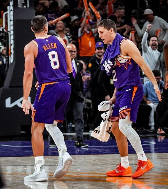 第二节湖人命中率下降,太阳队方面则是多点开花,内突外投打出了一波18-4的攻击波,43-33取得了10分的领先优势。后半段湖人在东契奇和里夫斯的带领下,回敬了太阳一波14-2的攻势。半场比赛战罢,两队49-49不相上下。